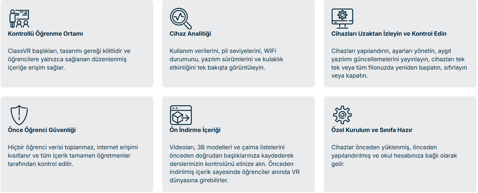ClassVR, tamamen eğitim için tasarlanmış, lider ve hepsi bir arada bir çözümdür. Güçlü XR donanımını, müfredata uyumlu sürükleyici içerikleri, ders planlama araçlarını ve kusursuz sınıf & cihaz yönetimini tek bir kolay kullanımlı platformda bir araya getirir.