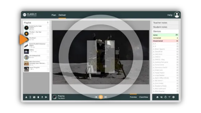 ClassVR portalı, amaç odaklı geliştirilmiş ve her başlıkla tamamen entegre çalışır; bu sayede eğitimcilere tüm VR öğrenme ortamları üzerinde gerçek zamanlı görünürlük ve tam kontrol sunar.