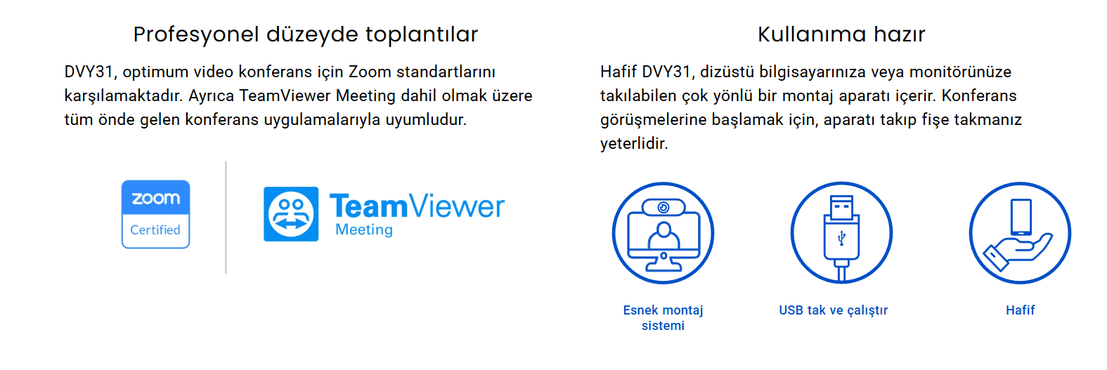 Ek yazılıma gerek yok, uğraş yok, zaman kaybı yok. DVY31; bilgisayarlar ve akıllı ekranlar için ideal bir çözümdür. Sadece monte edin, bağlayın ve görüşmelere hemen başlayın.