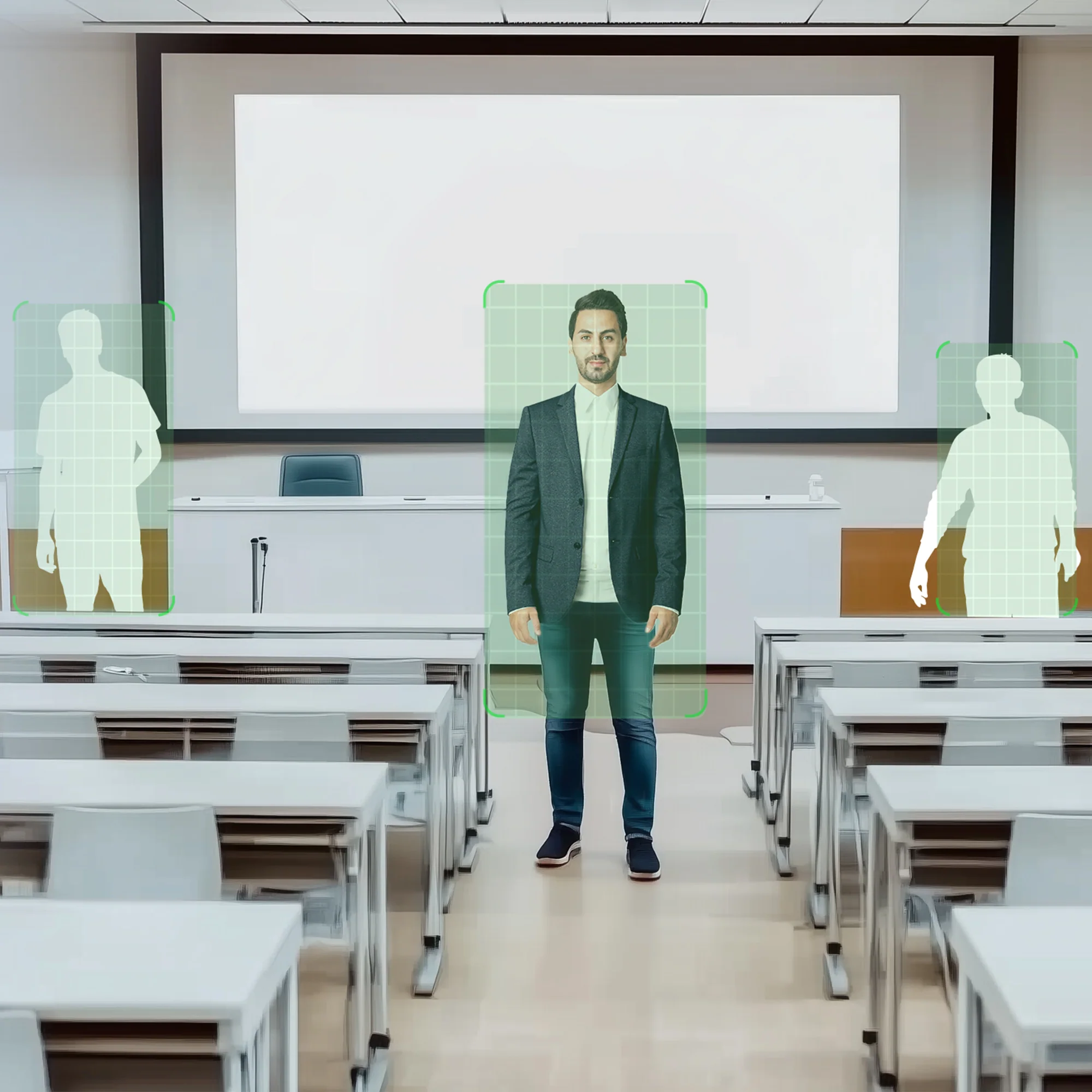 Konuşmacının hareketlerini gerçek zamanlı olarak izleyerek, onu kadrajın merkezinde tutar ve etkileyici, profesyonel bir sunum sağlar. |   |  |